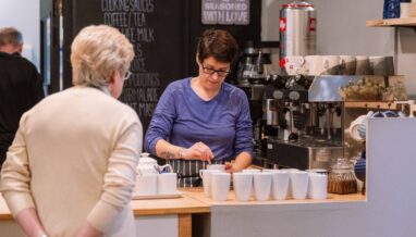 voluteer chatting to client over tea and biscuits